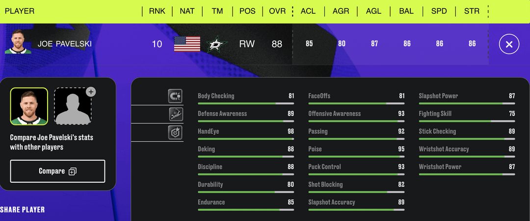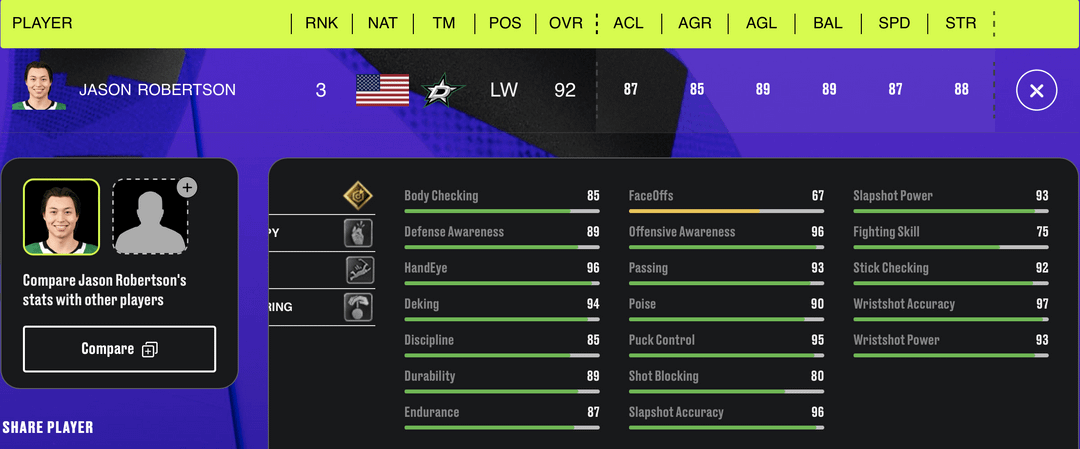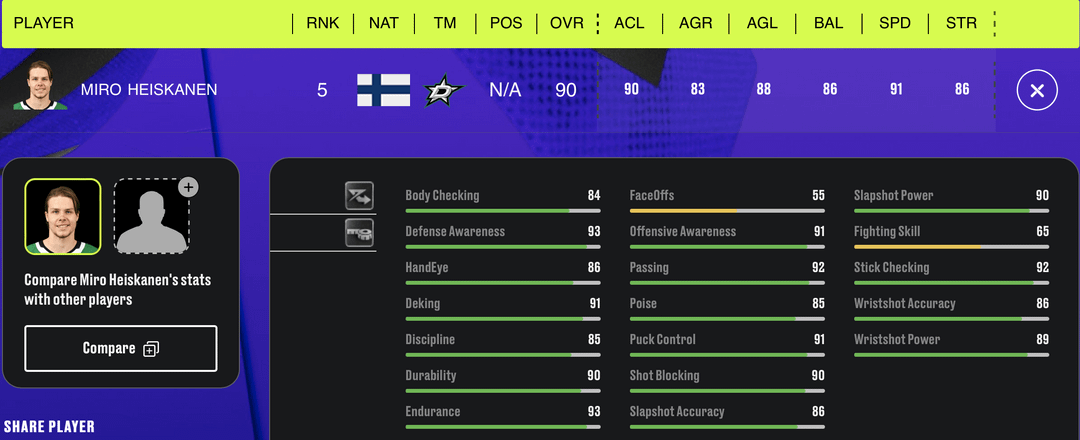 NHL 24 Top Rated Players – Dallas Stars by sports_drink Central DivisionDallas StarsWestern Conference Prev Post General Manager Patrik Allvin announced today that the #Canucks have placed G Spencer Martin on waivers for the purpose of assignment to Abbotsford (AHL). September 28, 2023 Next Post Predators Lose in OT to Bolts: A Little Rust, A Lot of Chemistry September 28, 2023 5 Comments sports_drink 3 years ago Can’t remember a time when we had this many top rated players in this game. Only thing we’re missing is a Top 20 Right Defensemen. Duhstee 3 years ago I think Miro needs to be a point or two higher. ShamanicEnzan 3 years ago Hintz keeps getting overlooked iAmCyberwaste 3 years ago Surprised Roope isn’t a 90, but then again the goalposts keep moving so who knows. Doza93 3 years ago They did Roope and Miro at least a lil dirty. Otherwise it’s respectable I suppose Write A CommentYou must be logged in to post a comment.