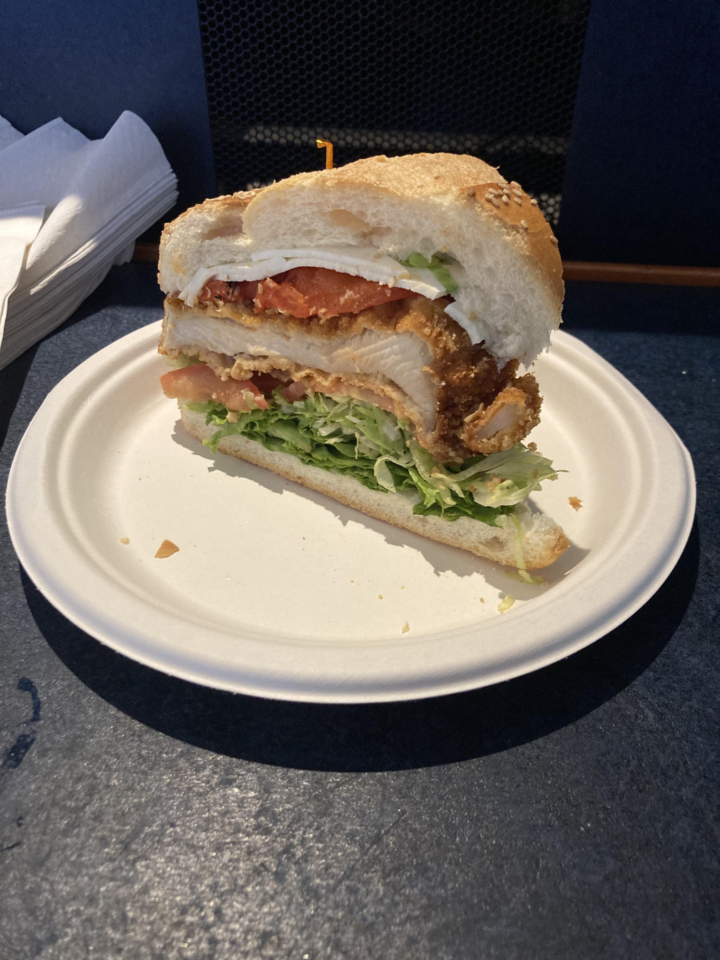 PanarinGoalSandwich 2 years ago Fried chicken cutlet with mozzarella, lettuce, tomato on a semolina hero