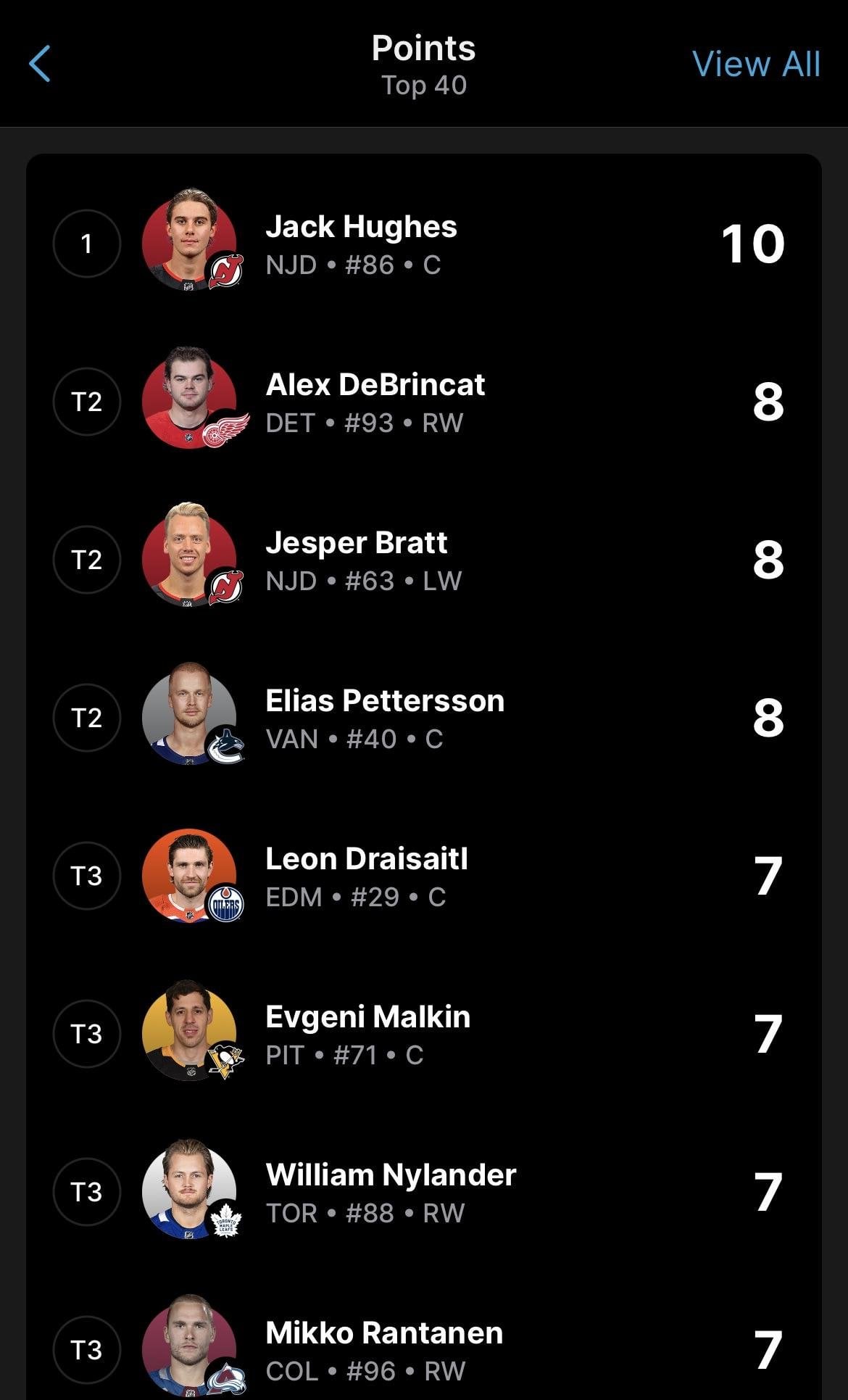 | 190 | [25 comments](/r/devils/comments/17d52d3/jack_hughes_is_the_nhl_points_leader_jesper_bratt/) | [Jack Hughes is the NHL points leader. Jesper Bratt is tied for 2nd.](https://i.redd.it/j6ap1wseqkvb1.jpg)|